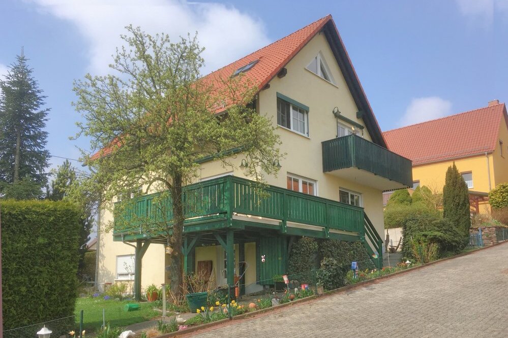 einstöckiger Balkon aus Holz mit Treppe seitlich