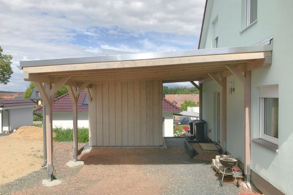 Carport aus Holz mit Flachdach und Abstellraum am Haus